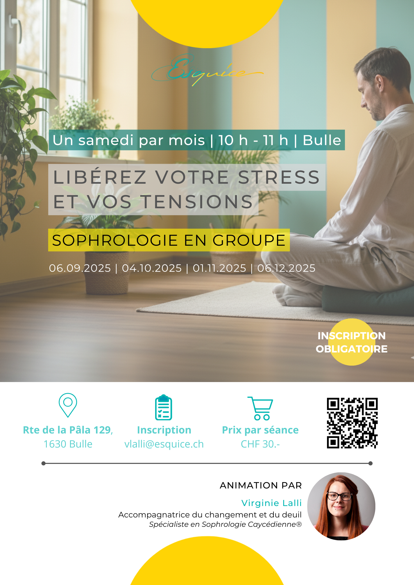 Par virement bancaire ou TWINT avant la séance en groupe ou l’atelier thématique.
