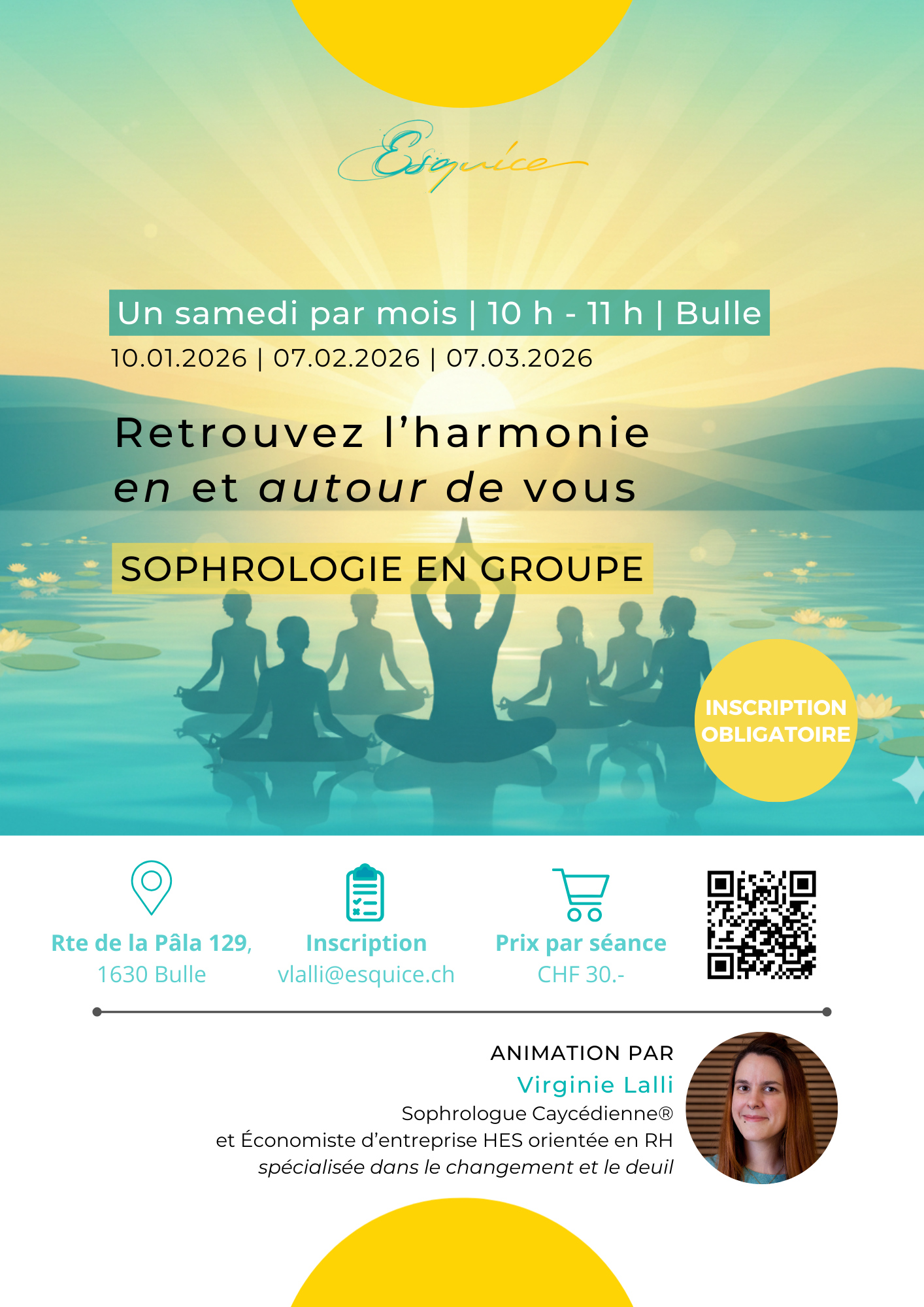 Par virement bancaire ou TWINT avant la séance en groupe ou l’atelier thématique.